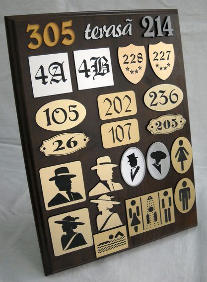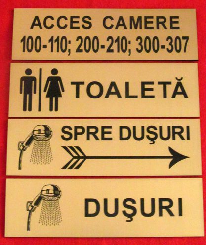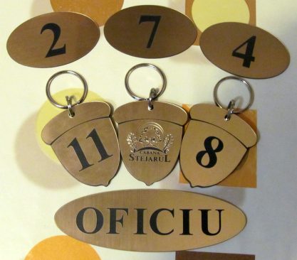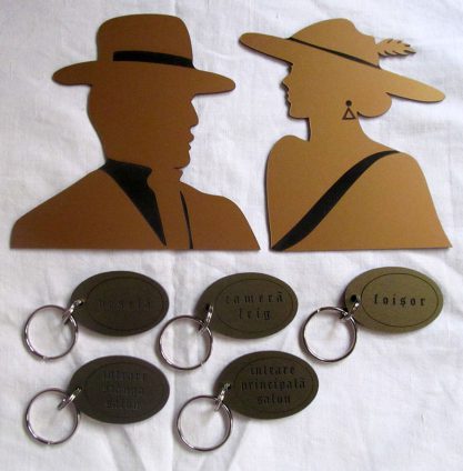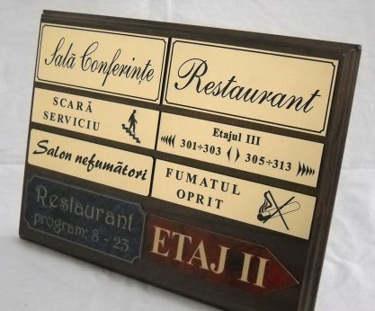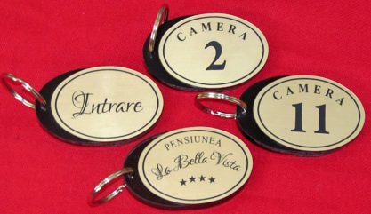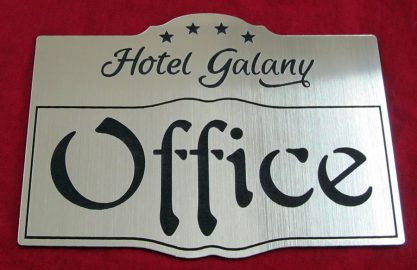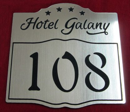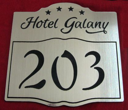 - Executăm întreaga gamă de plăci gravate necesare hotelurilor şi restaurantelor, atât pentru interior cât şi pentru exterior: numerotare camere, plăci etaj, ecusoane personal, plăci “rezervat”, personalizări panouri lift,